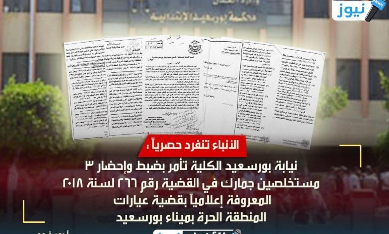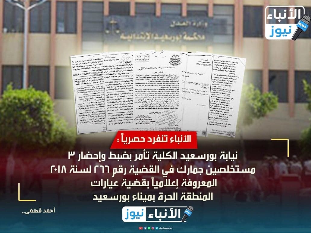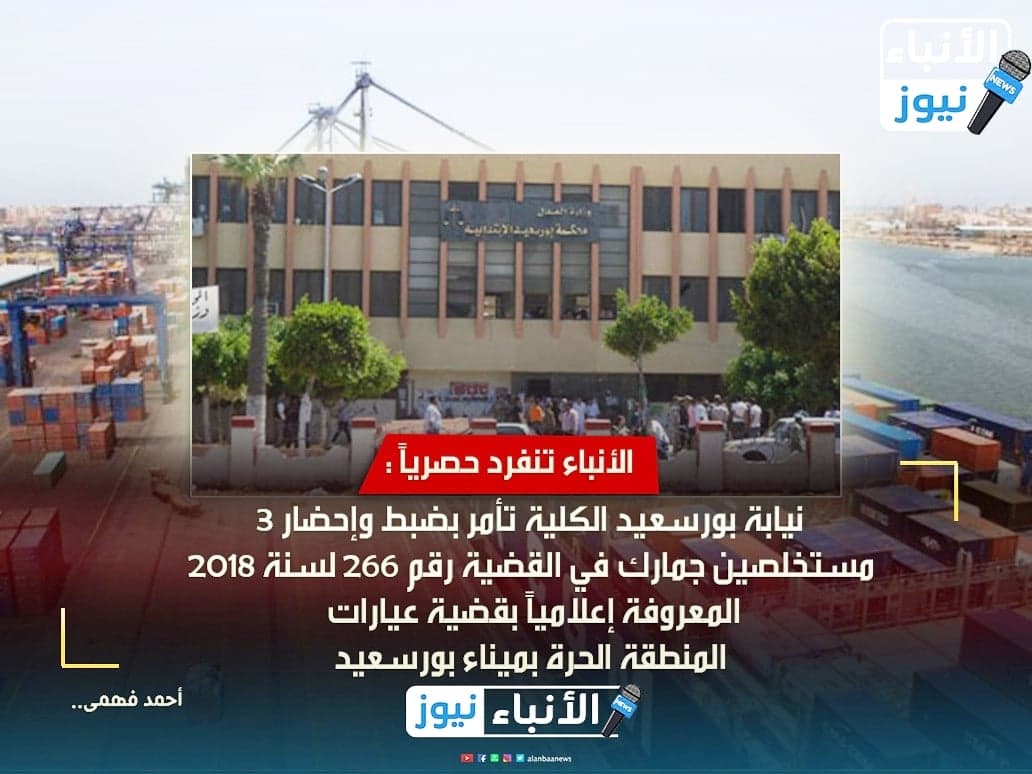 الأنباء تنفرد حصرياً : نيابة بورسعيد الكُلية تأمر بضبط وإحضار 3 مستخلصين جمارك في القضية رقم 266 لسنة 2018 المعروفة إعلامياً بقضية ((عيارات المنطقة الحرة)) بميناء بورسعيد