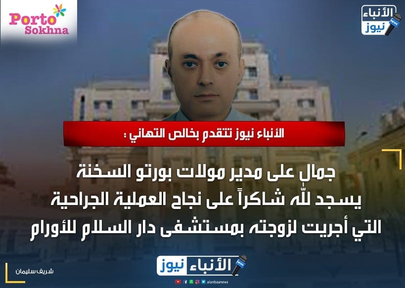 جمال علي مدير مولات بورتو السخنة يسجد لله شاكرا علي نجاح العملية الجراحية التي أجريت لزوجتة وشريكة حياتة ويتقدم بخالص الشكر والتقدير إلي مستشفى دار السلام للأورام وإلي السادة أطباء المستشفي وعلي رأسهم الاستاذ الدكتور أشرف شوقي والدكتور ابراهيم عبد الرحمن و الدكتور محمد النبراوي و الدكتور أحمد حلمي و الدكتور محمد قدر والاستاذة يسرا سيد زيدان سكرتيرة العمليات كما يشكر تمريض الدور الرابع بالمستشفي علي ما بذلوه من جهد وعلي رأسهم الأستاذة ثناء اسماعيل رئيسة التمريض والممرضة مني سيد الممرض احمد نور الدين وكافة التمريض والعاملين والعاملات بالمستشفي .