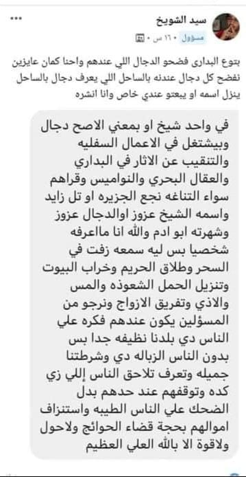 ظاهرة إنتشار أعمال الدجال والشعوذة والتنقيب عن الآثار،وإتخاذ الدجالين والسحرة محافظة أسيوط مسرحاً لمزاولة أنشطتهم الإجرامية،تحولت إلى كابوس يعاني منه أهالي المحافظة،مما دفع شباب مركز البداري بتدشين حملة عبر مواقع التواصل الإجتماعي فيسبوك بالصفحات الشخصية والجروبات،لنشر أسماء وعناوين هؤلاء السحرة والدجالين مطالبين الأهالي بالتفاعل مع المبادرة بالتعاون لكشف أسماء وعناوين الدجالين. حيث لاقت المبادرة تفاعلاً كبيراً على مواقع التواصل،وقام شباب البداري بنشر أشهر هؤلاء الدجالين بقرى ومركز البداري مطالبين القيادات الأمنية بسرعة ضبطهم .