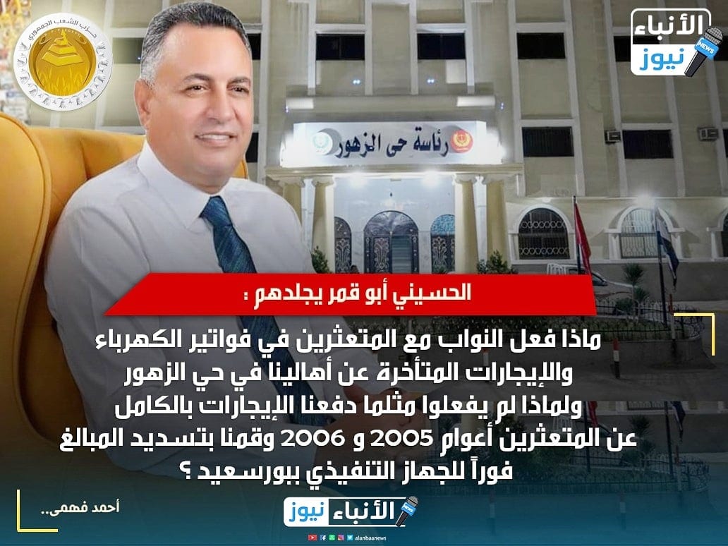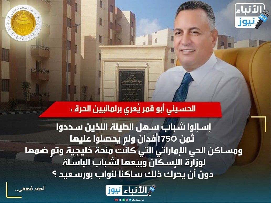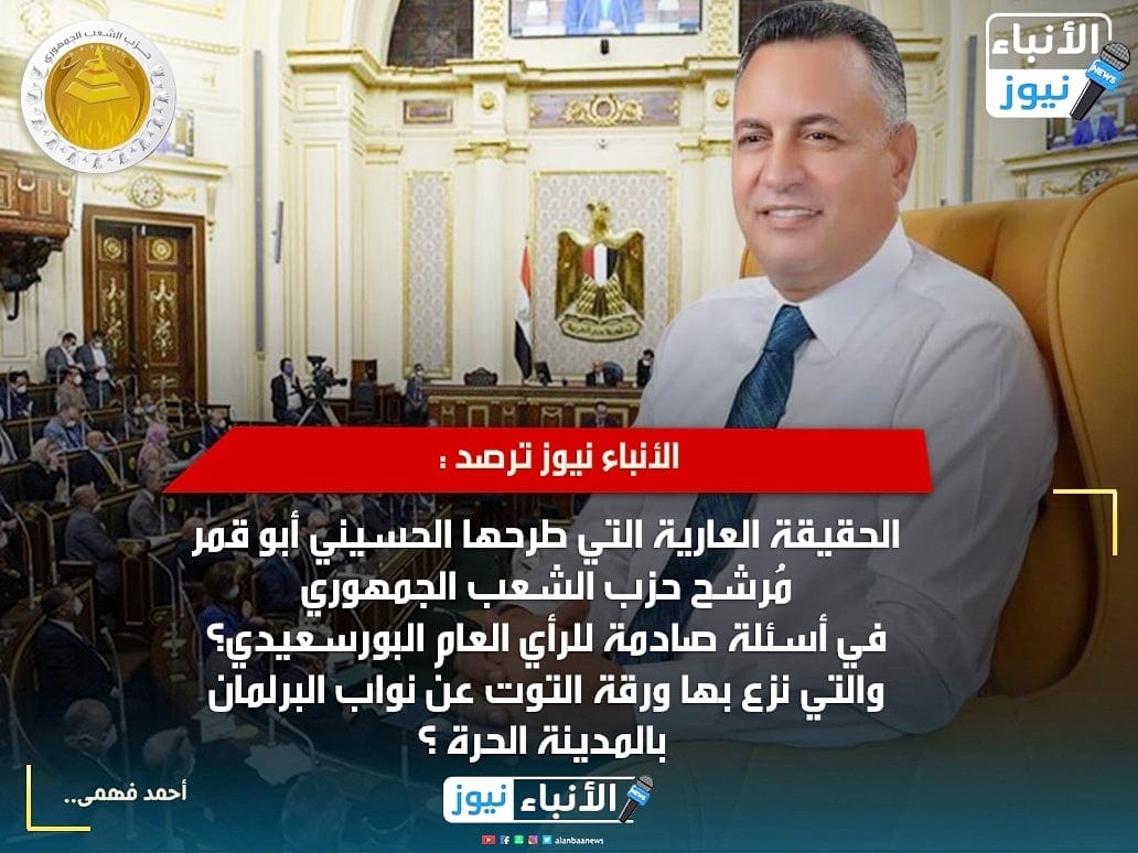 الأنباء نيوز ترصد : الحقيقة العارية التي طرحها الحسيني أبو قمر مُرشح الحزب الجمهوري في أسئلة صادمة للرأي العام البورسعيدي والتي نزع بها ورقة التوت عن نواب البرلمان بالمدينة الحرة ؟