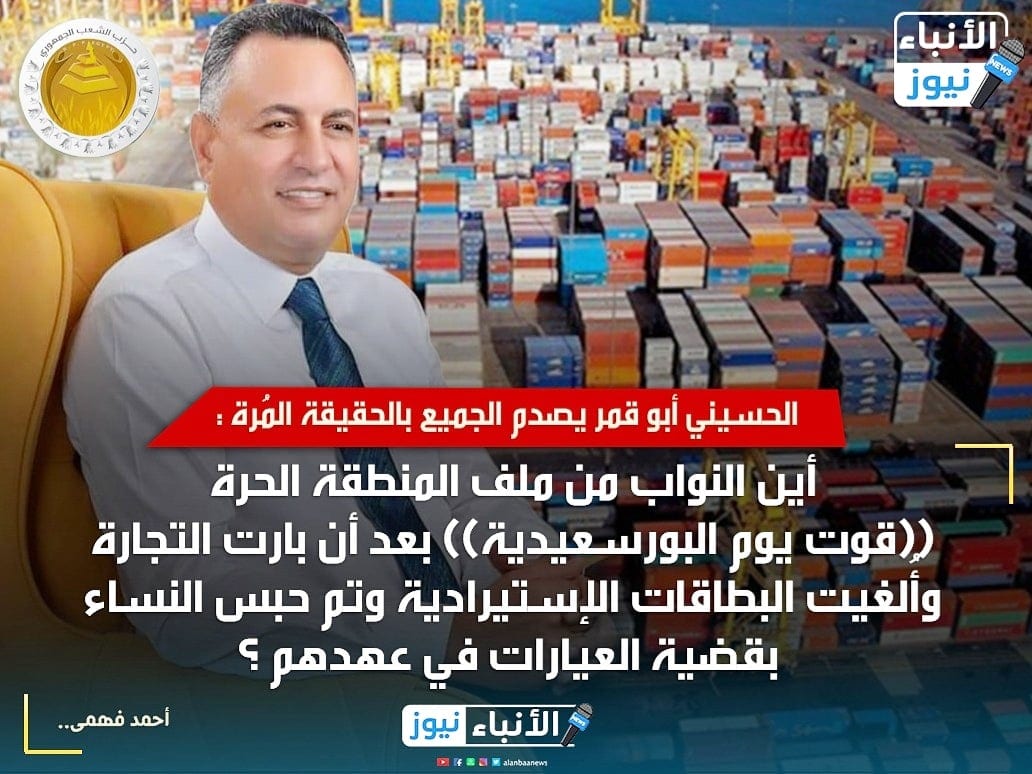 الحسيني أبو قمر يصدم الجميع بالحقيقة المُرة : أين النواب من ملف المنطقة الحرة ((قوت يوم البورسعيدية)) بعد أن بارت التجارة وأُُلغيت البطاقات الإستيرادية وتم حبس النساء بقضية العيارات في عهدهم !!