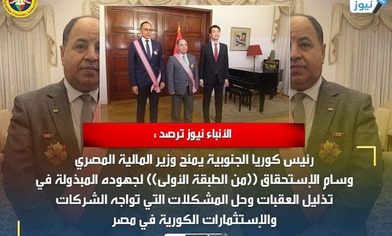 الأنباء نيوز ترصد : رئيس كوريا الجنوبية يمنح وزير المالية المصري وسام الإستحقاق ((من الطبقة الأولى)) لجهوده المبذولة في تذليل العقبات وحل المشكلات التي تواجه الشركات والإستثمارات الكورية في مصر