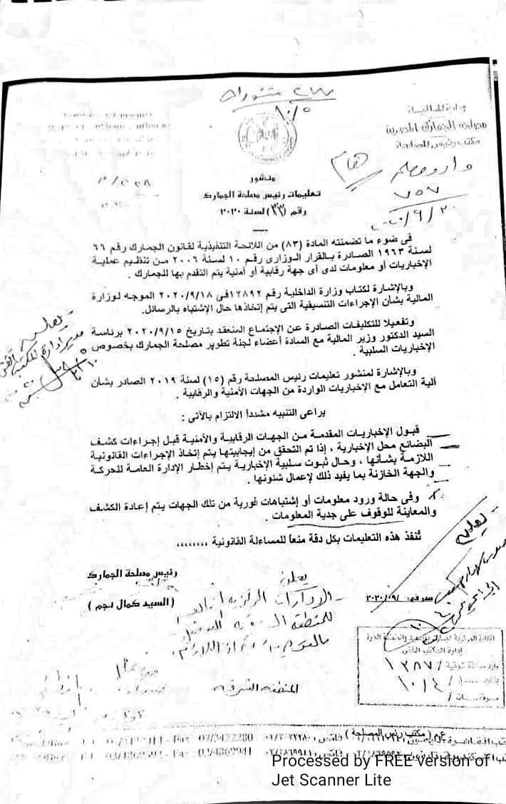 أصدر السيد نجم رئيس مصلحة الجمارك منشور تعليمات حمل رقم (33) لسنة 2020 والخاص بالإجراءات التنسيقية للإخباريات الجمركية طبقاً لكتاب وزارة الداخلية رقم 12892 لسنة 2020 الموجه لوزارة المالية بشأن الإجراءات التي يتم إتخاذها حال الإشتباه بالرسائل .