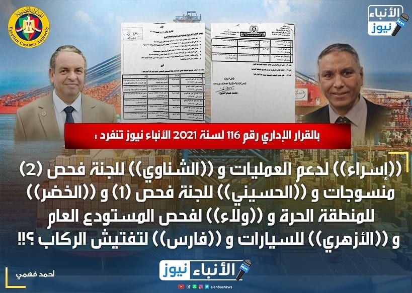 وعلمت الأنباء نيوز أن هناك حركة آخري كـ توابع لحركة التنقلات سالفة الذكر ستشمل العديد من رؤساء لجان الفحص وتغييرات دورية لمأموري ومديري التعريفة كما كان متبع بالسابق وهو من أساس الشفافية والإنضباط في العمل الجمركي والذي كان مُتبعاً منذ 5 سنوات وتم إلغاؤه في غفلة من الزمن داخل ميناء بورسعيد والمواني المصرية .