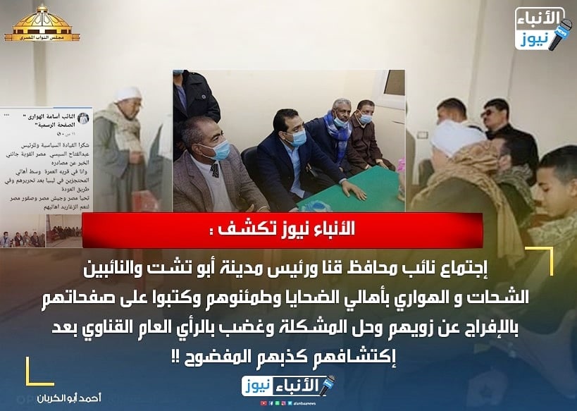 إجتماع نائب محافظ قنا ورئيس مدينة أبو تشت والنائبين الشحات و الهواري بأهالي الضحايا وطمئنوهم وكتبوا على صفحاتهم بالإفراج عن زويهم وحل المشكلة وغضب بالرأي العام القناوي بعد إكتشافهم كذبهم المفضوح !!