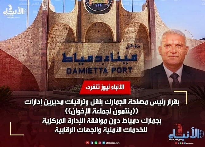 الأنباء نيوز تنفرد بقرار رئيس مصلحة الجمارك بنقل وترقيات مديرين إدارات ((ينتمون لجماعة الإخوان)) بجمارك دمياط دون موافقة الإدارة المركزية للخدمات الأمنية والجهات الرقابية