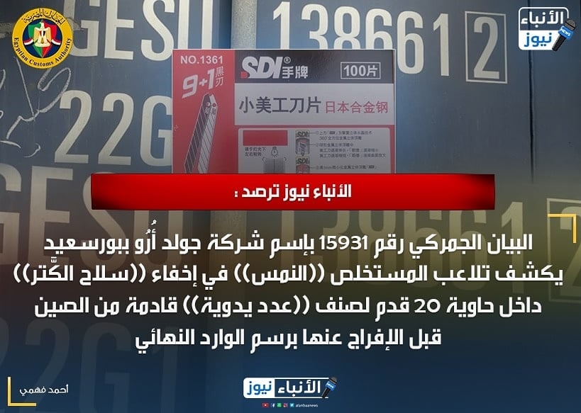 البيان الجمركي رقم 15931 بإسم شركة جولد أُرُو ببورسعيد يكشف تلاعب المستخلص ((النمس)) في إخفاء ((سلاح الكَّتر)) داخل حاوية 20 قدم لصنف ((عدد يدوية)) قادمة من الصين قبل الإفراج عنها برسم الوارد النهائي