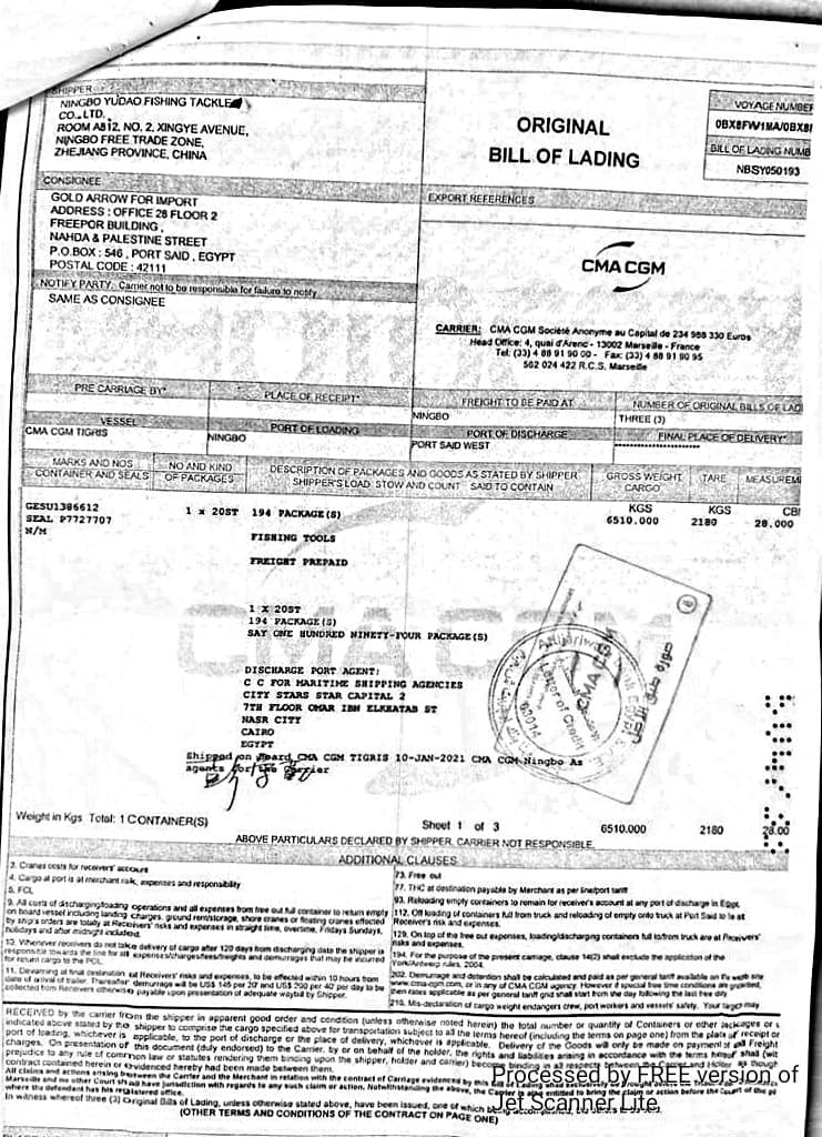 وكانت مباحث الميناء برئاسة العقيد أحمد برغوت رئيس المباحث والرائد محمد العفني معاون المباحث بالإشتراك مع محمد حنفي رئيس الإدارة المركزية لجمارك بورسعيد والإدارة المركزية للفحص بالأشعة قد تقدموا بالإخبارية رقم 729 في 22 مارس 2021 بورود معلومات سرية على بوليصة الشحن رقم 050193 بالبيان الجمركي رقم 15931 بإسم شركة ((جولد أورو)) بإسم ((شادي . ج . ش . س)) على الحاوية رقم GESU 138661222G1 بأن مشمولها المدون بالأوراق عبارة عن مستلزمات وعدد صيد وبداخلها أشياء محظورة وممنوع تداولها بالأسواق المصرية لخطورتها على الأمن العام .