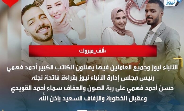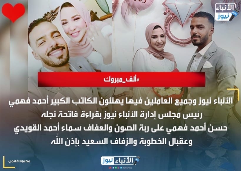 الكاتب الصحفي الكبير شريف سليمان رئيس تحرير الأنباء نيوز وجميع العاملين فيها يهنئون الكاتب الكبير أحمد فهمي رئيس مجلس إدارة الأنباء نيوز بقراءة فاتحة نجله الكابتن حسن أحمد فهمي على ربة الصون والعفاف الأنسة سماء أحمد سليمان القويدي بحضور عائلي وعقبال الخطوبة والزفاف السعيد بإذن الله .