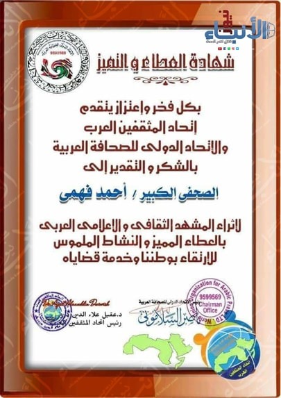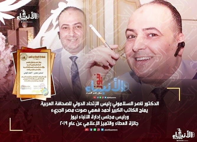 أختار الدكتور ناصر السلامونى رئيس الإتحاد الدولى للصحافة العربية والدكتور عقيل علاء الدين رئيس إتحاد المثقفين العرب الكاتب الكبير أحمد فهمي ((صوت مصر الجرىء)) ورئيس مجلس إدارة الأنباء نيوز منح شهادة ((العطاء والتميز الصحفى لعام 2019)) كأفضل صحفى فى حفلهم السنوى الكبير الذى يقام بجامعة الدول العربية بالقاهرة الشهر القادم بإذن الله .