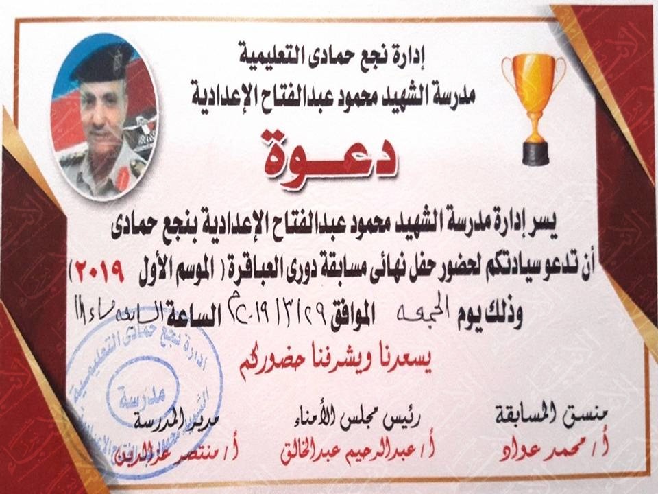 تُنظم مدرسة الشهيد محمود عبد الفتاح حسن ” الإعدادية الجديدة ” بنجع حمادي في السابعة من مساء الجمعة 29 من مارس 2019 حفل ختام برنامج ” العباقرة ” الموسم الأول والذي أقيمت فعالياته علي مدار العام الدراسي 2018/ 2019 برعاية عبد الحق المدثر الراعي الرسمي للحفل.