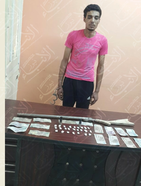 وتم ضبطه وبحوزته بندقية خرطوش و25 جرام من مسحوق الهيروين المٌخدر .