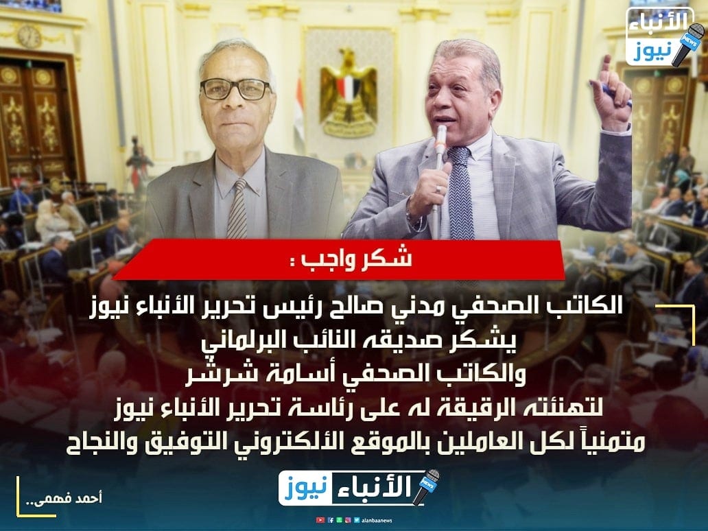 أسرة تحرير الأنباء نيوز تقدم بخالص الشكر والأمتنان للنائب البرلماني على تهنئته لرئيس التحرير متمنياً لكل العاملين بالموقع الألكتروني التوفيق والنجاح