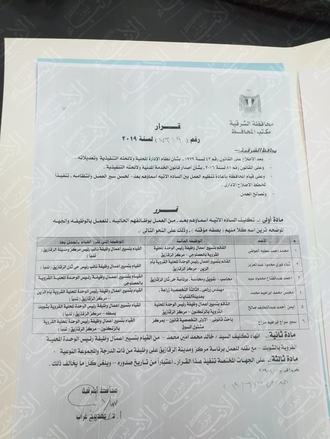 كذلك تم تعيين محمد أحمد عطية العوضى للقيام بتسيير أعمال وظيفة نائب رئيس مركز ومدينة الزقازيق .