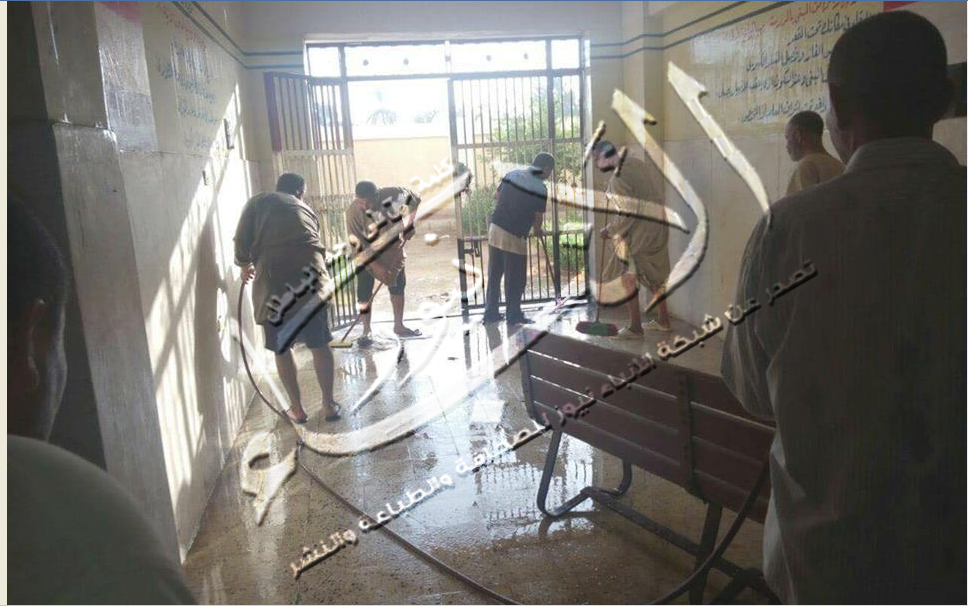 ورش المياه على سلم المدرسة وغسل دورات المياه استعداداً للعام الدراسي وذلك بمشاركة كلا من احمد رجب وكيل المدرسة ومدين مصطفي وسعيد فوزي ورضا العربي وعبد الفتاح لاشين وعددا من العمال وعبر عددا من الاهالي عن فرحتهم بهذا العمل مؤكدين ان هذا يعتبر نموذجا مشرفا للمدرس والقائد الناجح مطالبين جميع مديري المدارس باتخاذه قدوة وقال عبد الرحمن عبد اللطيف مدير المدرسة إنه على الرغم أن اليوم الجمعة إجازة رسمية إلا أن المعلمون حرصوا على التوجه للمدرسة وقاموا بارتداء زي العمل بمشاركة العمال ورفعوا القمامة وأوراق .