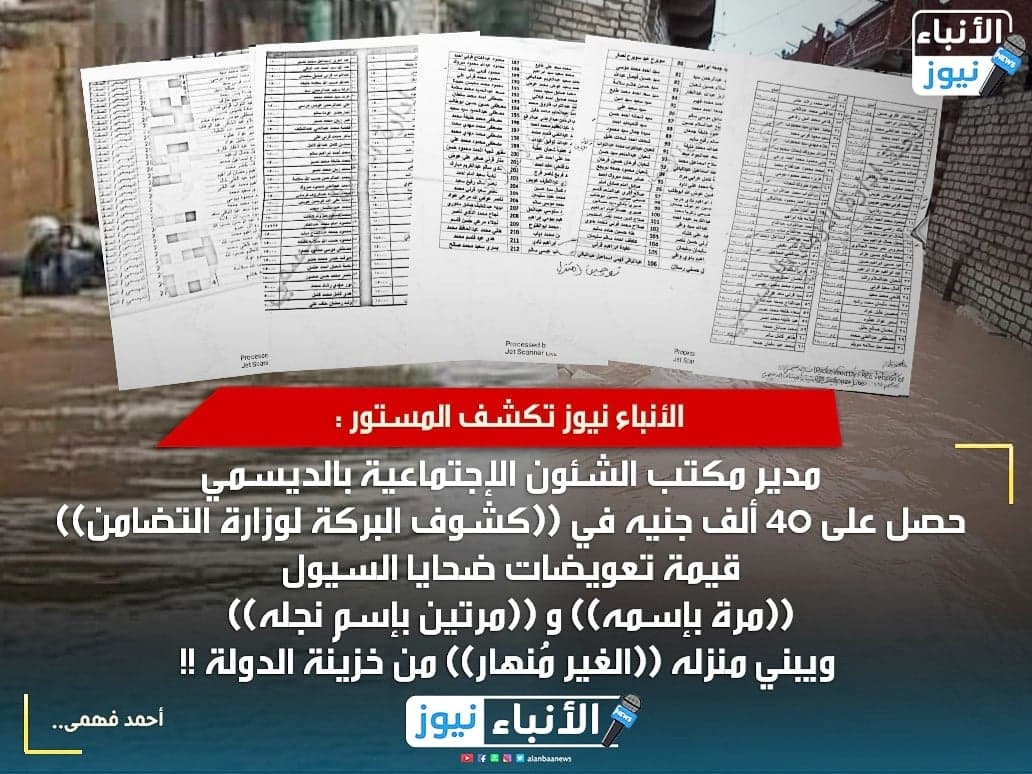 مدير مكتب الشئون الإجتماعية بالديسّمي حصل على 40 ألف جنيه في ((كشوف البركة لوزارة التضامن)) قيمة تعويضات ضحايا السيول ((مرة بإسمه)) و ((مرتين بإسم نجله)) ويبني منزله ((الغير مُنهار)) من خزينة الدولة !!
