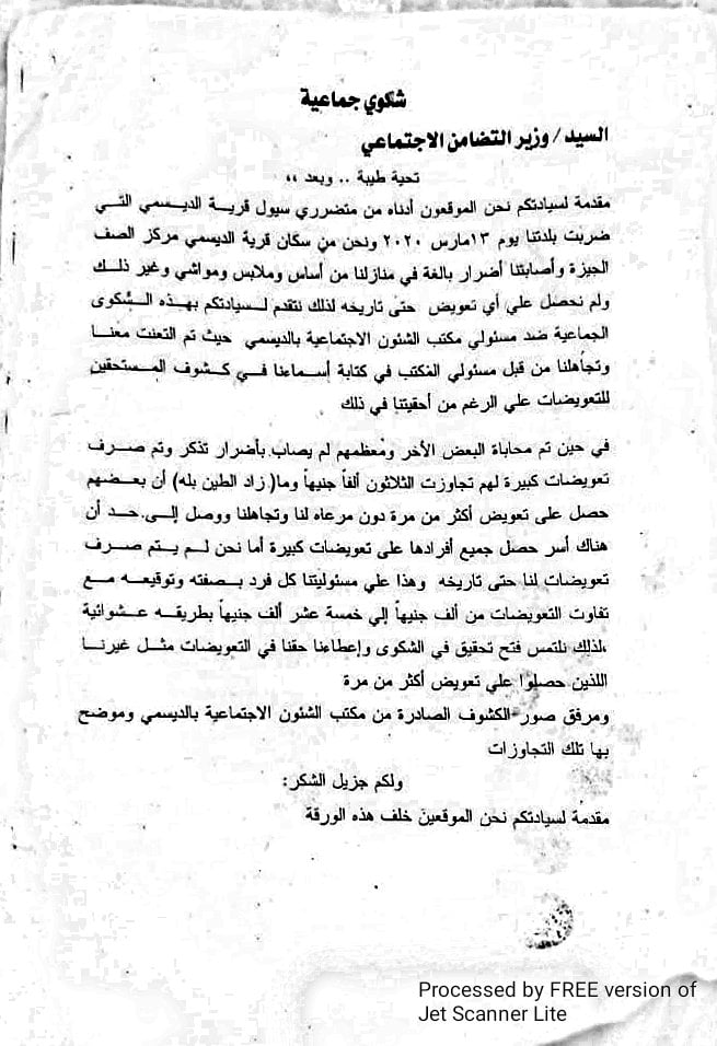 حيث تقدم المئات من قرية الديسمي بإستغاثات متوالية لوزيرة التضامن ومديريتها بالجيزة حملت رقم 16439 لسنة 2020 بوزارة التضامن وكذا الشكور رقم 16528 لسنة 2020 برئاسة مجلس الوزراء التي تم توقعيهم جميعاً عليها إلا أن تلك المذكرات والإستغاثات وردودها كان مصيرها أدراج ومكاتب التضامن بالجيزة والوزارة دون جدوى ودون رقيب أو حسيب .