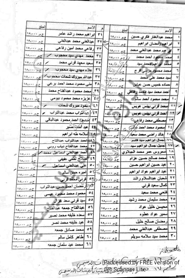 في الوقت نفسه الذي وضع نجله (((جميل جمال سيد))) في الكشف الأول تحت رقم ((17)) كما وضع نفس إسمه نجله أيضاً في الكشف الثاني تحت رقم ((55)) ليحصل هو ونجله على إجمالي 40 ألف جنيه من تعويضات القرية كما وضع منزله الغير مُنهار من جراء السيول ضمن المنازل التي يتم بنائها من جديد من أجل بناء دور آخر لنجله على حساب المال السايب من خزينة الدولة بوزارة التضامن المنهوبة .