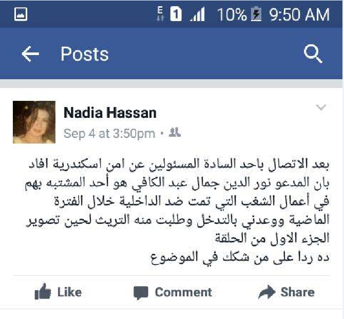 تباشر نيابات غرب الأسكندرية التحقيقات في البلاغ رقم 4442 المقدم ضد نادية . ح والتى تنتحل صفة معدة برنامج ( انتباه ) الذي تقدمه الاعلامية منى العراقى بقناه المحور الفضائية حيث قامت بنشر منشورات عبر صفحتها الخاصة على موقع التواصل الإجتماعى فيس بوك تقوم بإبتزاز أحد الأشخاص بالأسكندرية من خلال إلصاق إتهامات وهمية له وأدعاءات منها كاذبة ضده .