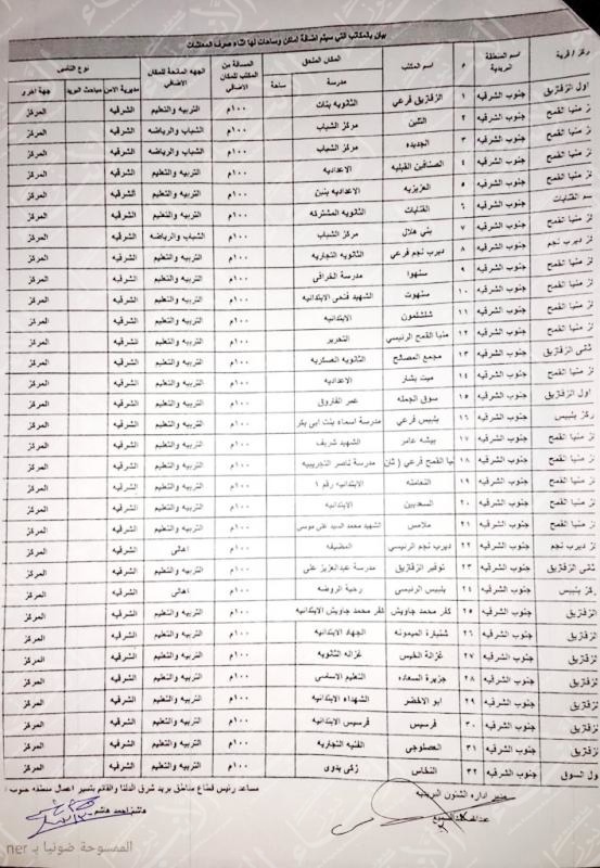 مركز الزقازيق : مدارس ( الثانوية بنات – الثانوية العسكرية – عمر الفاروق– عبد العزيز علي – كفر محمد جاويش – الجهاد بشنباره الميمونه – غزاله الثانوية – جزيرة السعادة للتعليم الاساسي – ابو الاخضر الابتدائية – فرسيس الابتدائية – الفنية التجارية بالعصلوجي ).