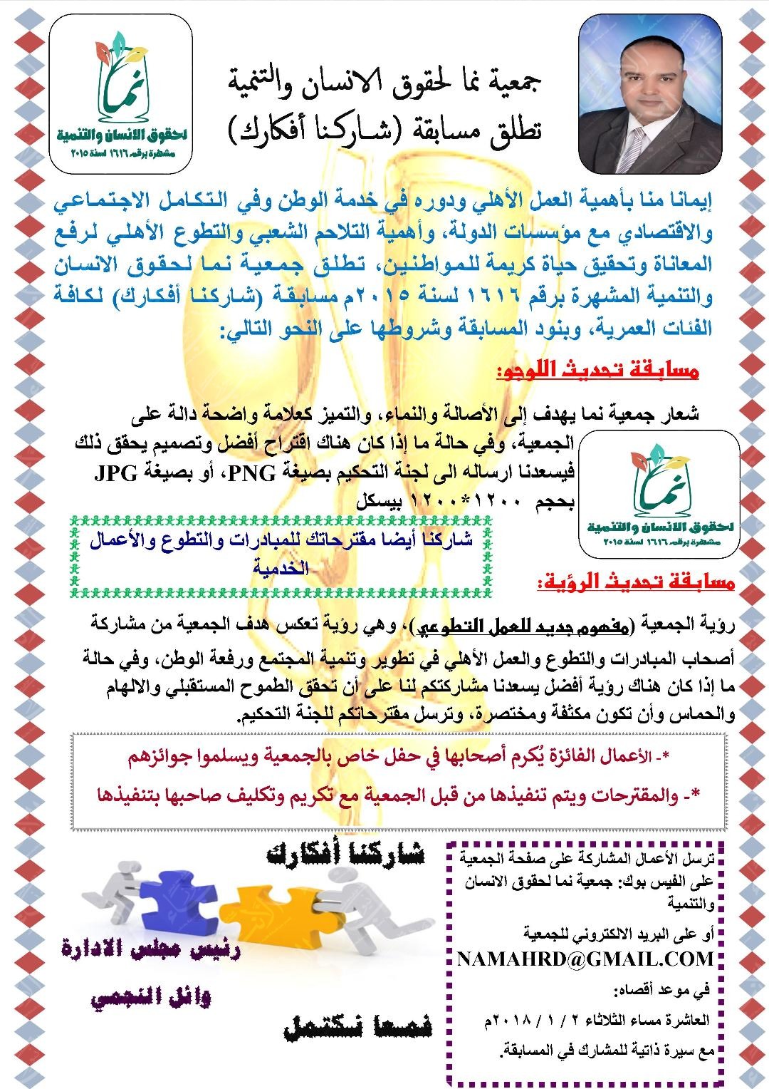 أعلن وائل النجمي رئيس مجلس ادارة جمعية نما لحقوق الانسان والتنمية المشهرة برقم 1616 لسنة 2015م اطلاق مسابقة (شاركنا أفكارك) وهي مسابقة تهدف إلى تدعيم روح العمل التطوعي والتأكيد على قيم الولاء والانتماء لدى الشباب والمواطنين.