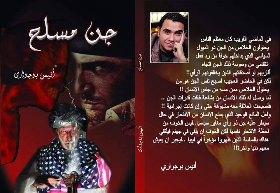 جن مسلح هو كتاب ساخر وجرئ في معرض القاهرة للكتاب للسينارست المتألق أنيس بوجوارى حيث يطرح الكتاب موضوع شائك من خلال اسرة ليبية سلبية لا تتبع أى توجه سياسى وتتعرض لموقف يقلب حياتها رأسا” على عقب ويتحول منزلهم لساحة حرب بين أفرادها .