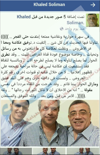 نشر الأستاذ خالد سليمان المستشار القانوني لقناة الفراعين عبر حسابه الشخصي على الفيسبوك أنه في سهرة حوارية و نقاشية ممتعة امتدت حتى الفجر .. تناولت فيها الحديث عن كل شئ ، وألتقيت د .توفيق عكاشة و معنا الأستاذ عز الاطروش و نقلت لعكاشة كل ما ابلغوني به من رسائل و تحيات و خاصة موضوع عودة قناة الفراعين للبث .
