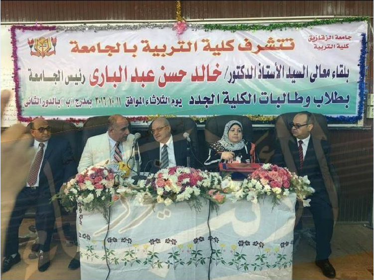 إلتقى الدكتور خالد عبد البارى رئيس جامعة الزقازيق اليوم بأعضاء هيئة التدريس والطلاب بكلية التربية يرافقه د.عادل عبد الله عميد الكلية ود. أبو المجد الشوربجي وكيل الكلية لشئون البيئة ، د.عبد المنعم نافع وكيل الكلية لشئون الدراسات العليا ود.إيمان كاشف وكيل الكلية لشئون التعليم والطلاب لتهنئتهم ببدء العام الدراسي الجديد . وخلال اللقاء قال نحن الآن فى رحاب جامعة الزقازيق التي ننتمي إليها جميعا والتى تمثل المنارة العلمية فى مجتمع قوامه أكثر من 9مليون نسمة هم عدد مواطني محافظة الشرقية ، فالجامعة بها حوالى 200ألف طالب وطالبة ما بين المرحلة الأولى والدراسات العليا والتعليم المفتوح فى وجود كوكبة من أعضاء هيئة التدريس كل عضو يمثل مدرسة علمية ، مشيرا إلي أن كلية التربية من أقدم كليات الجامعة وواحدة من ست كليات خرج بها قرار إنشاء جامعة الزقازيق وفصلها عن جامعة عين شمس ، وتعد كلية التربية من أهم الكليات علي الإطلاق فهى المسئولة عن تربية وتخريج الأجيال للمساهمة في التنمية البشرية فإذا نجحت الجامعة فى تخريج معلم ومعلمة بمستوي جيد فإن ذلك يعود على مستقبل التعليم والتنمية البشرية التي هدفها الإنسان ومن ثم التنمية الشاملة التي ننشدها في الفترة الحالية التي تمر بها مصرنا الغالية .