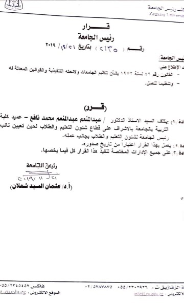 أصدر اليوم الخميس  الدكتور عثمان شعلان رئيس جامعة الزقازيق القرار رقم ٢١٣٥ بتكليف  الدكتور عبد المنعم نافع عميد كلية التربية بالاشراف على قطاع شئون التعليم و الطلاب بجانب عمله لحين تعيين نائب لشؤون التعليم والطلاب. ويتقدم المركز الإعلامي بخالص التهنئة والامنيات بدوام التوفيق.
