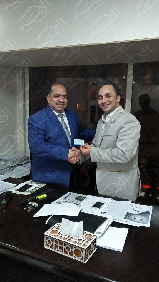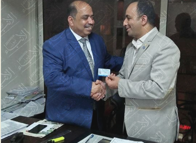 رئيس مكتب منظمة الأمم المتحدة للسلام العادل والشامل بالشرق الأوسط بالقاهرة يٌسلم عضوان بالمكتب بطاقة اعتمادهما