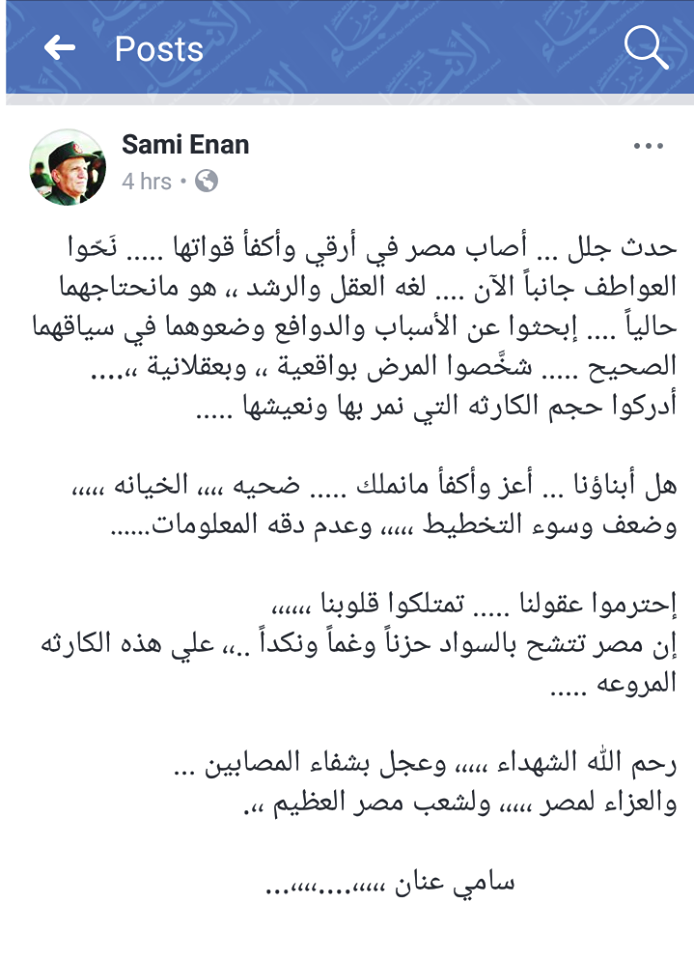 وهو نفس المعني الذي تحدث فيه أيضا الفريق سامي عنان حيث مطالباً بالبحث عن الدوافع والأسباب ووضعهما في سياقهما الصحيح كما تساءل هو أيضاً فى تغريدة نسبت له هل أبناؤنا ضحية الخيانة .