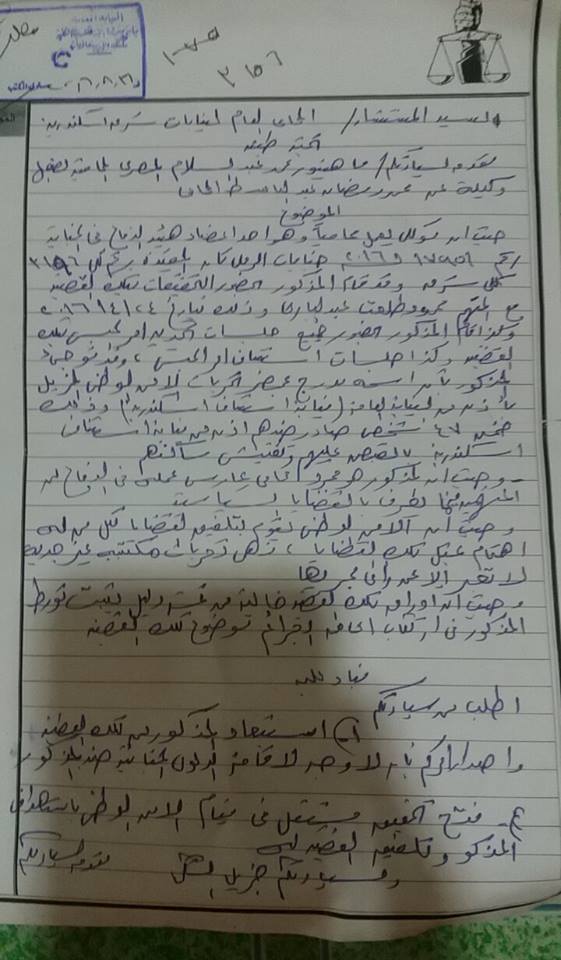 قالت أ . ماهينور المصرى ، إنها تقدمت اليوم بطلب إلى رئيس نيابة شرق الإسكندرية الكلية ، بصفتها وكيلة عن أ . محمد رمضان المحامى ، طالبة فى ختامه باستبعاده من الجناية رقم 17951 لسنه 2016 جنايات رمل ثان ، والخاصة بأحداث تيران وصنافير ، والصادر فيها إذن من النيابة العامة بالقبض على الزميل بناء على تحريات الأمن الوطنى ،.