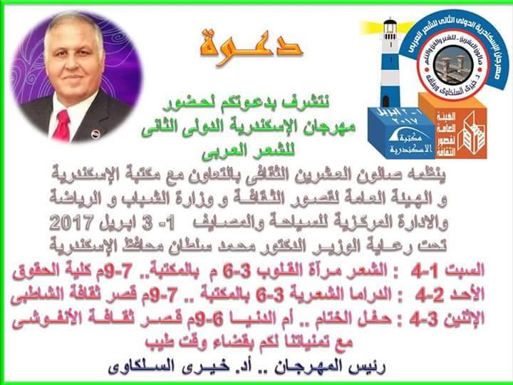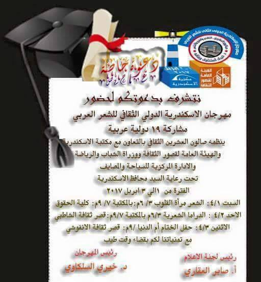 صرح لنا اليوم أ. صابر العقاري ’ رئيس لجنة الإعلام ’ أن صالون العـشرين الثقافي بالإسكندرية برئاسة الشاعرد. خيري السلكاوي يستعد لتنظيم مهرجان الإسكندرية الدولي الثاني للشعـر العربي ، والذي يشارك فيه كوكبة من كبار الشعـراء والأدباء العـرب من 19 دولة عربية ،.