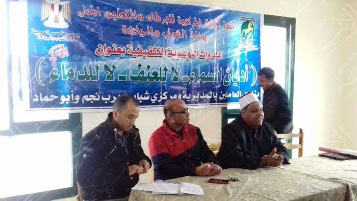 ومن جانبه صرح وائل الألفي مدير مديرية الشباب والرياضة بالشرقية عن عقد ندوة توعية من مخاطر الإرهاب بعنوان” أديان السماء لا للعنف لا للدماء” بمركز شباب مدينة أبو حماد بحضور علماء من الأزهر الشريف و100 شاب و فتاة من أعضاء مراكز الشباب تتناول التوعية بالأخطار المحيطة بالمجتمع في ظل الأحداث التي تستهدف وحدة المجتمع ودور رجال الدين في الحد من التطرف والعنف.