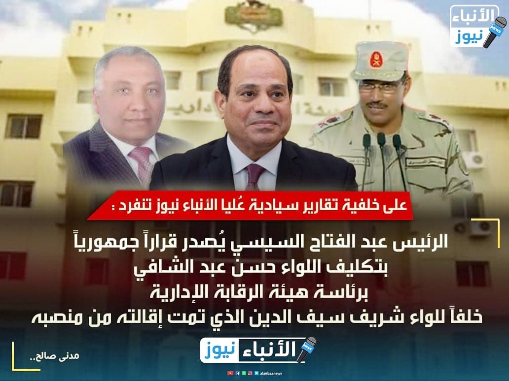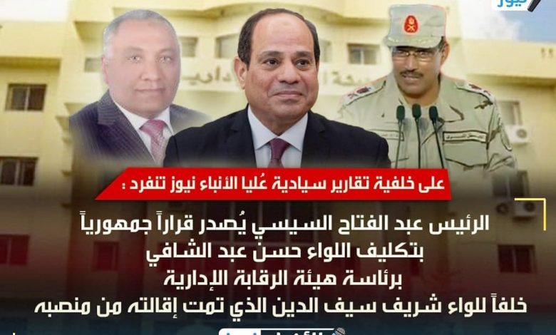 على خلفية تقارير سيادية عُليا الأنباء نيوز تنفرد : الرئيس عبد الفتاح السيسي يُصدر قراراً جمهورياً بتكليف اللواء حسن عبد الشافي برئاسة هيئة الرقابة الإدارية خلفاً للواء شريف سيف الدين الذي تمت إقالته من منصبه