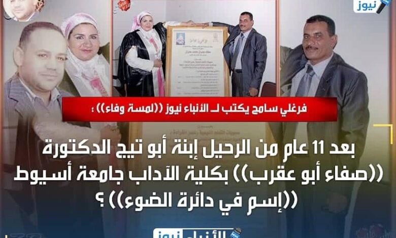 فرغلي سامح يكتب ل الأنباء نيوز ((لمسة وفاء)) : بعد 11 عام من الرحيل إبنة أبو تيج الدكتورة ((صفاء أبو عقرب)) بكلية الآداب جامعة أسيوط ((إسم في دائرة الضوء)) ؟