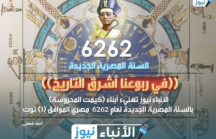 تُهنيء الأنباء نيوز ربوع الشعب المصري العظيم من أبناء ((كيمت المحروسة)) و ((كنانة الله في أرضه)) بالسنة المصرية الجديدة لعام 6262 مصرية الموافق ((1)) توت وهي السنة التي تبدأ مُعلنة إنتهاء فصل الصيف والجفاف وبداية الأمطار والخير عند قدماء المصريين والذي يؤكد دائماً تاريخهم العريق أنه ((في ربوعنا أشرق التاريخ)) على ضفاف الكنانة في ((مصر العظمى)) .