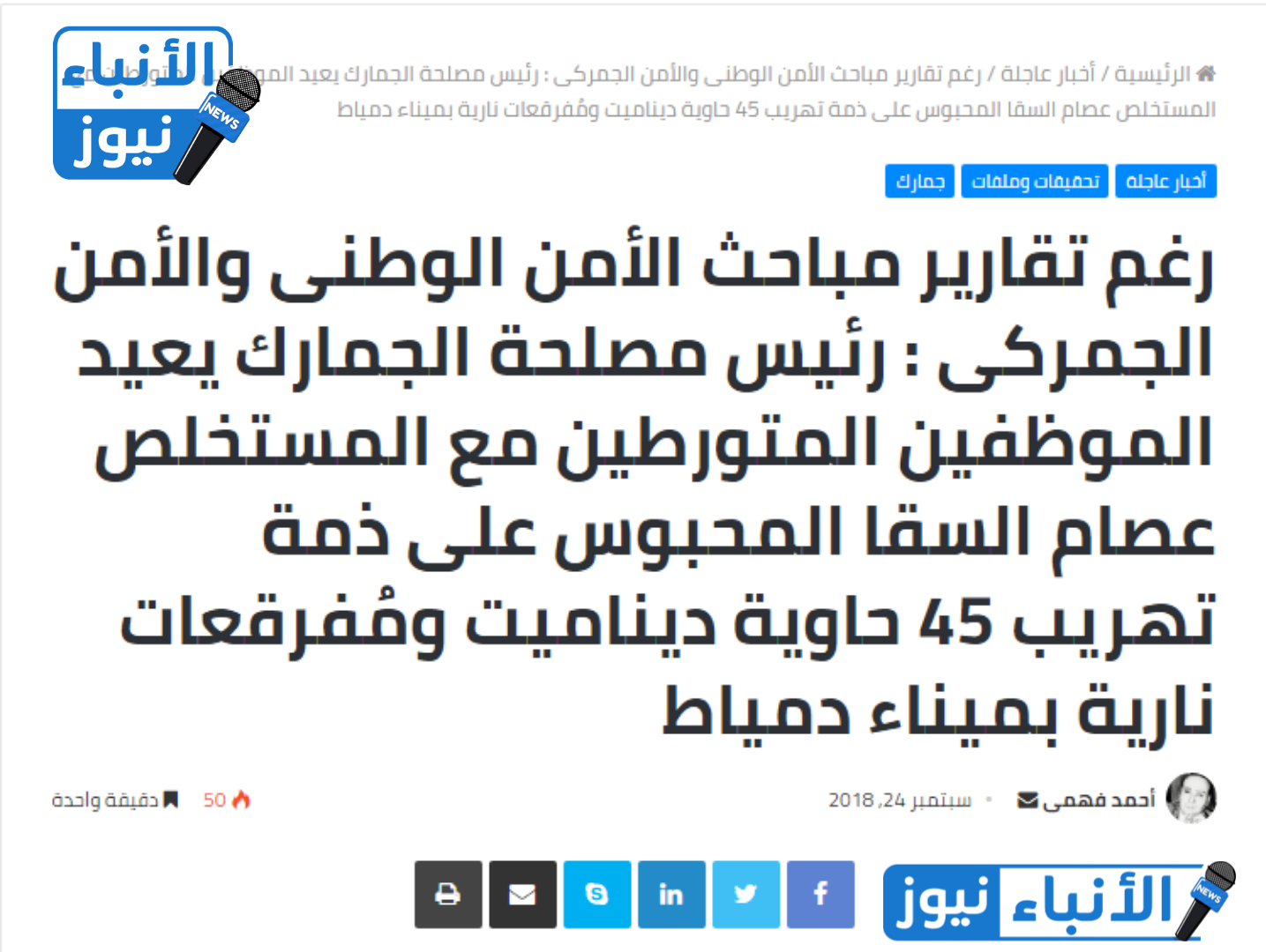 تنفرد الأنباء نيوز بإذن الله خلال أيام بفتح الملف المسكوت عنه بفعل فاعل بميناء دمياط ونشر التفاصيل الحصرية بالمستندات عن إحالة كشافين ومتمنين من رجال ((عزبة النجم الجمركي)) للمحكمة التأديبية العُليا في قضية تهريب الديناميت والطلق الناري والحبوب الجنسية المُنشطة لصالح المستخلص عصام السقا داخل عشرات الحاويات القادمة من الصين على أنها ((خردوات)) والتي ضبطتها إحدى الجهات الرقابية رفيعة المستوى عام 2018 وأنفردت الأنباء نيوز بتفجيرها حصرياً .