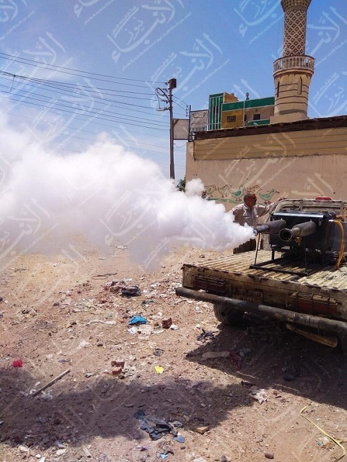 وجه المحافظ رؤساء المراكز والمدن والأحياء والوحدات المحلية القروية بضرورة التنسيق مع الإدارات الصحية التابعة لمديرية الصحة لشن حملات يومية صباحاً ومساءاً وتوفير سيارات محملة بجهاز التيفا المخصص لرش الحشرات الطائرة بالمبيد الحشرى المصرح به من وزارة الصحة وذلك لمكافحة الحشرات ناقلات أمراض الصيف .