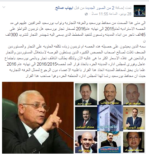 ويحسب للواء عادل الغضبان محافظ بورسعيد قرار المد فى ذلك التوقيت لأن هناك عدد كبير من الحصص الإستيرادية الصغيرة لم يتم إستخدامها لإستغلال سماسرة الحصص الإستيرادية لهم بشراء الحصة بـ 2000 جنيه للعامين مما أثر على حركة بيع تلك الحصص لتدنى أسعارها وأن قرار محافظ بورسعيد المنفرد أصاب أعضاء الغرفة التجارية ببورسعيد فى مقتل وأسقط ورقة التوت التى كنت بينهم وبين تجار بورسعيد .