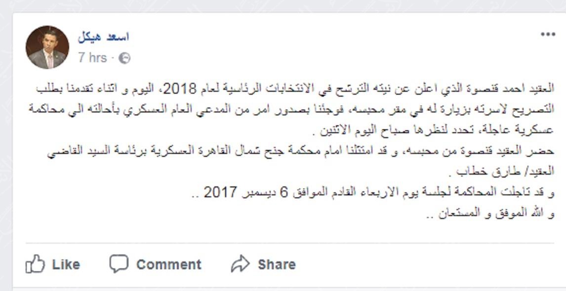 صرح أسعد هيكل محامي العقيد احمد قنصوة الذي أعلن عن نيته الترشح في الإنتخابات الرئاسية لعام 2018، اليوم أنه و أثناء تقدمه بطلب التصريح لأسرته بزيارة له في مقر محبسه، فوجئ بصدور أمر من المدعي العام العسكري بإحالته إلي محاكمة عسكرية عاجلة، تحدد لنظرها صباح أمس الاثنين .