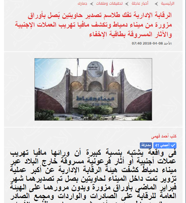 وكانت الأنباء نيوز قد نشرت مخالفات رئيس الإدارة المركزية لجمارك دمياط فى عدة موضوعات مختلفة وفى مقدمتها الواقعة التى كشفت عنها هيئة الرقابة الإدارية والتى يشتبه فيها بنسبة كبيرة أن ورائها مافيا تهريب عملات أجنبية أو أثار فرعونية مسروقة خارج البلاد عبر ميناء دمياط حيث كشفت هيئة الرقابة الإدارية عن أكبر عملية تزوير تمت داخل الميناء لحاويتين (بصل) تم تصديرهما شهر فبراير الماضى 2018 بأوراق مزورة وبدون مرورهما على الهيئة العامة للرقابة على الصادرات والواردات ومجمع الصادر بجمرك دمياط ودون أن يشعر بهما موظفى الأبواب الجمركية أو مكافحة عمليات التهريب الجمركى وكانت البداية عند إكتشاف ضباط الرقابة الإدارية قيد الشهادة رقم 2282 صادر دمياط فى 10 فبراير 2018 بعدد حاويتين أرقام 9214303 و9651030 وبداخلهما 3147 كرتونة بصل طازج مصدر إلى جبل على بدولة الإمارات إلا أن المفاجأة كانت داخل شركة تداول الحاويات بدمياط والتى أكدت شحن الحاويتين المذكورتين قبل ذلك التاريخ وتحديداً فى 2 فبراير 2018 وكشف البحث أنها تم تصديرها بدون بيان جمركى وقد أثبتت المراجعة الدقيقة من هيئة الرقابة الإدارية أن كافة التوقيعات بالبيان الجمركى المذكور مزورة وتم إحالة الموضوع برمته للنيابة العامة للتحقيق والتى أمرت بضبط وإحضار المستخلص الجمركى بالإضافة إلى صاحب البيان وموظفى الجمارك المتورطين فى الفضيحة بميناء دمياط .