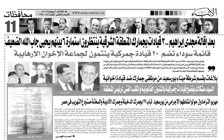 و كانت جريدة الأنباء الدولية قد واصلت فى عددها صباح اليوم كشف اللوبى الإخوانى المسيطر على المنطقة الشرقية للجمارك و خاصة موانىء بورسعيد و دمياط و هو الملف المسكوت عنه داخل الجمارك و خاصة المنطقة الشرقية و التى تحتاج إلى ثورة تطهير من قيادات الجماعة الإرهابية الموجودين فى مناصب حساسة و خطيرة تهدد الأمن القومى المصرى .