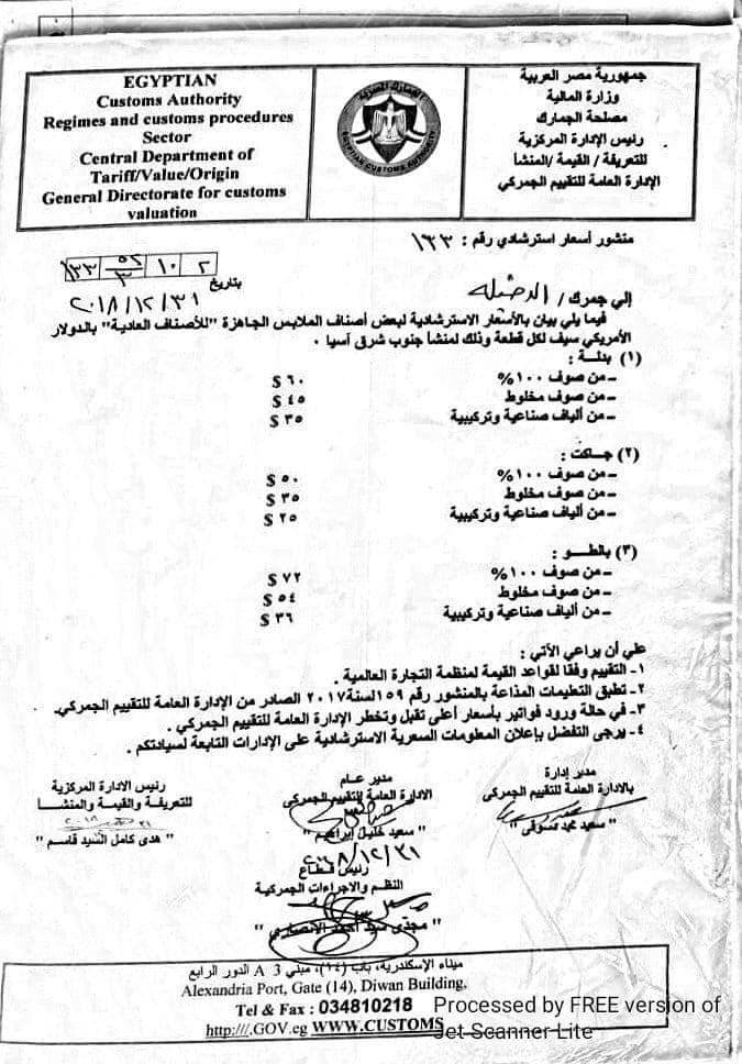 وبالرغم من أن منشور مصلحة الجمارك الذى ينظم العمل بالوزن والذى تنفرد الأنباء نيوز بنشره والذى يحمل رقم (1) لسنة 2013 وأصدره الخبير الجمركى حسن حلوسة رئيس الإدارة المركزية للتعريفة والقيمة والمنشأ قد جاء فيه أن يتم التقييم طبقاً للقواعد الواردة بإتفاقية القيمة لمنظمة التجارة العالمية وأن منشورات الأسعار الصادرة من الإدارة الامة للتقييم الجمركى بالإدارة المركزية للتعريفة والقيمة والمنشأ هى أسعار إسترشادية تتعامل معها لجان التتمين بالمواقع التنفيذية بالمرونة المناسبة من حيث الكمية والمستوى التجارى وطريقة الدفع والجودة والمنشأ من حيث رداءة المنتج أو جودته العالية وأن يتم حجز عينات لجميع أنواع رسائل المنسوجات والملابس المستوردة وأن تتم المعاينة الكاملة والتتمين بالسعر المقبول جمركياً وإدراج وقيد البضائع المفرج عنها أول بأول دون المعاملة بالوزن الأعمى الموجود الآن بالموانى ويستفيد من إستمراره كل المهربين والمتلاعبين .