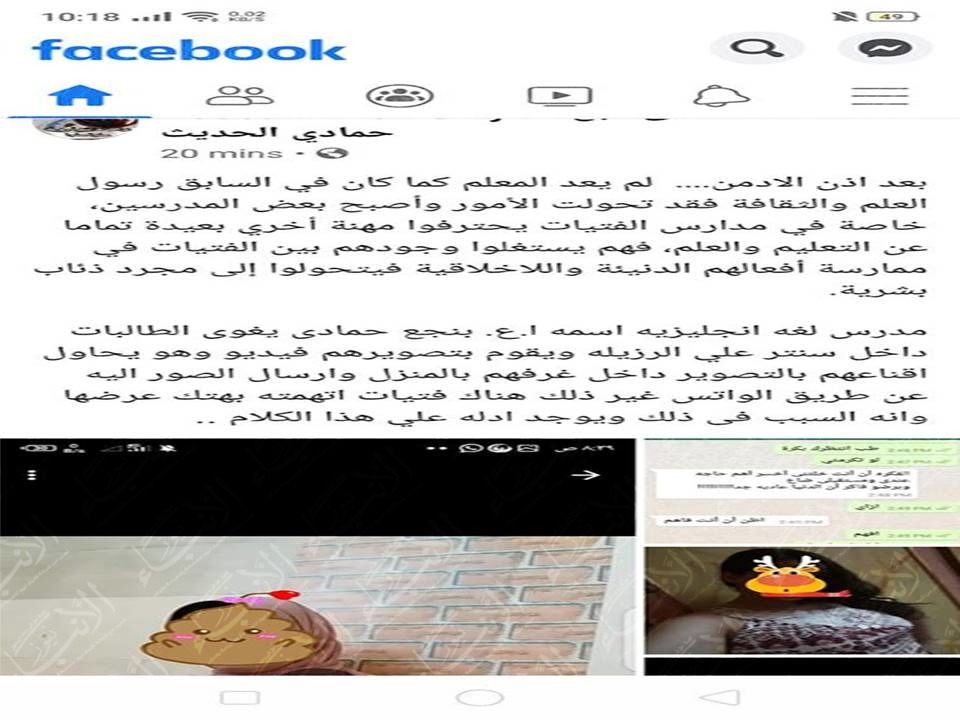 الواقعة التي يتداولها رواد ” الفيسبوك ” بنجع حمادي تتمثل في قيام مدرس لغة انجليزية يدعي ” أ . ع ” يقوم بغواية وتحريض الطالبات بسنتر تعليمي شهير بنجع حمادي علي الرذيلة ويقوم بتصويرهن فيديو كما يحاول إقناعهن بتصوير أنفسهن في غرفهن بالمنزل وإرسال الصور إليه عبر “الواتس آب” فضلًا عن قيام بعض الفتيات باتهامه بهتك عرضهن .