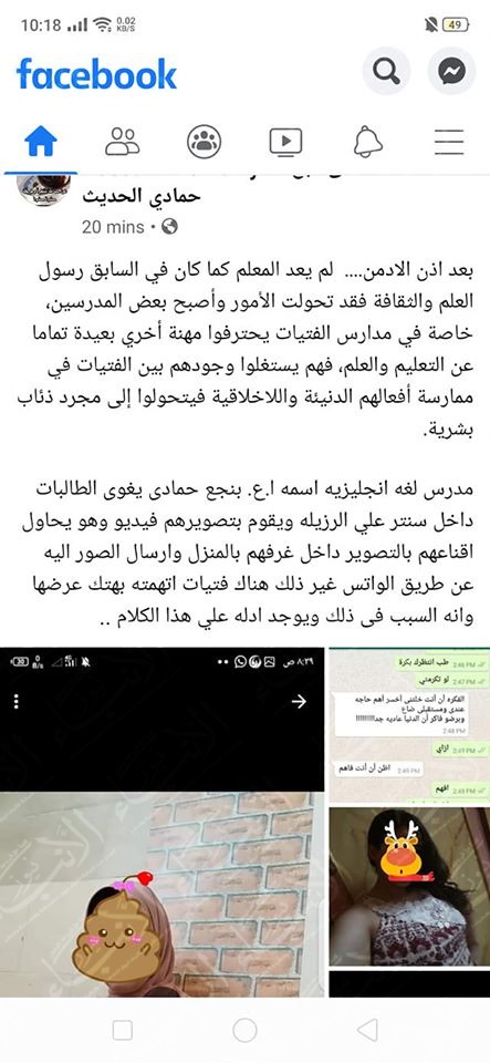 الواقعة التي يتداولها رواد ” الفيسبوك ” بنجع حمادي تتمثل في قيام مدرس لغة انجليزية يدعي ” أ . ع ” يقوم بغواية وتحريض الطالبات بسنتر تعليمي شهير بنجع حمادي علي الرذيلة ويقوم بتصويرهن فيديو كما يحاول إقناعهن بتصوير أنفسهن في غرفهن بالمنزل وإرسال الصور إليه عبر “الواتس آب” فضلًا عن قيام بعض الفتيات باتهامه بهتك عرضهن .