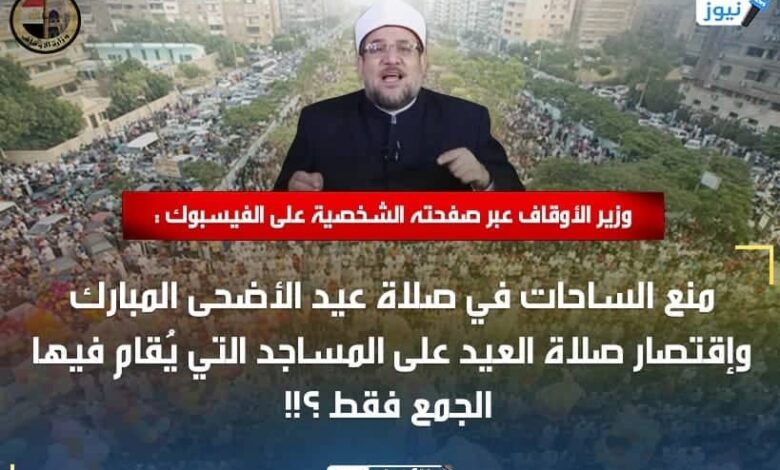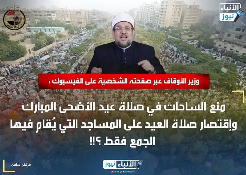 وزير الأوقاف عبر صفحته الشخصية على الفيسبوك : منع الساحات في صلاة عيد الأضحى المبارك وإقتصار صلاة العيد على المساجد التي يُقام فيها الجمع فقط ؟!!
