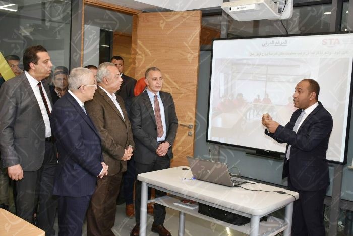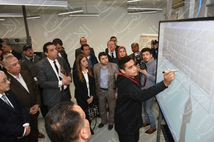 تفقد الوزير والمحافظ قاعات محاضرات الأكاديمية واستمع لشرح تفصيلي عن المناهج الدراسية المقدمة بالأكاديمية وقام أحد الطلاب بقسم مكونات الطاقة بتقديم الشرح العلمي والنظري للمادة وكيفية الربط بين التكنولوجيا وتقديم المنهج المدرسي .