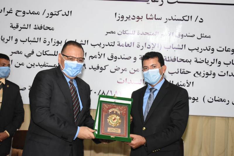 شهد الدكتور أشرف صبحي وزير الشباب والرياضة والدكتور ممدوح غراب محافظ الشرقية إحتفالية تكريم وتوزيع حقائب الحماية من فيروس كورونا ” كوفيد 19 ” للمستفيدين من المساحات الأمنة للفتيات والسيدات الوافدات من الدول العربية .