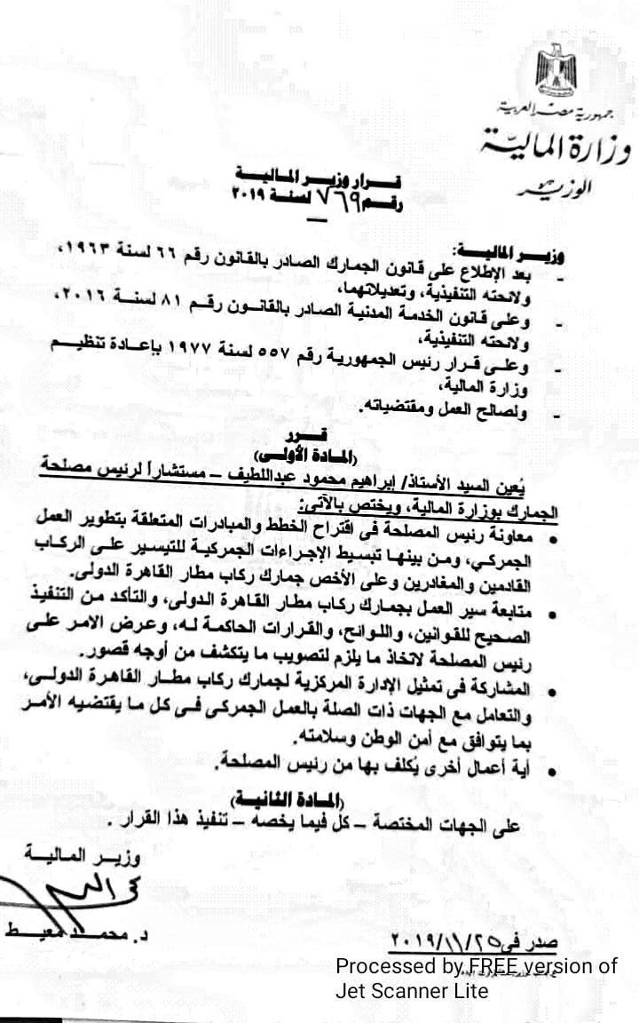 فلم ينتهى الأمر بالطرمخة فقط على وقائع القضية برُمتها مثل عشرات القضايا التى أُهدرت فيها ملايين مصلحة الجمارك ووزارة المالية عن عمد بل فوجىء الجميع أول أمس بإصدار الدكتور محمد معيط وزير المالية القرار رقم 769 لسنة 2019 بتاريخ الإثنين الماضى 25 نوفمبر 2019 الذى ننفرد بنشره حصرياً بتعيين إبراهيم محمود عبد اللطيف مستشاراً للسيد نجم رئيس مصلحة الجمارك لشئون الركاب !!